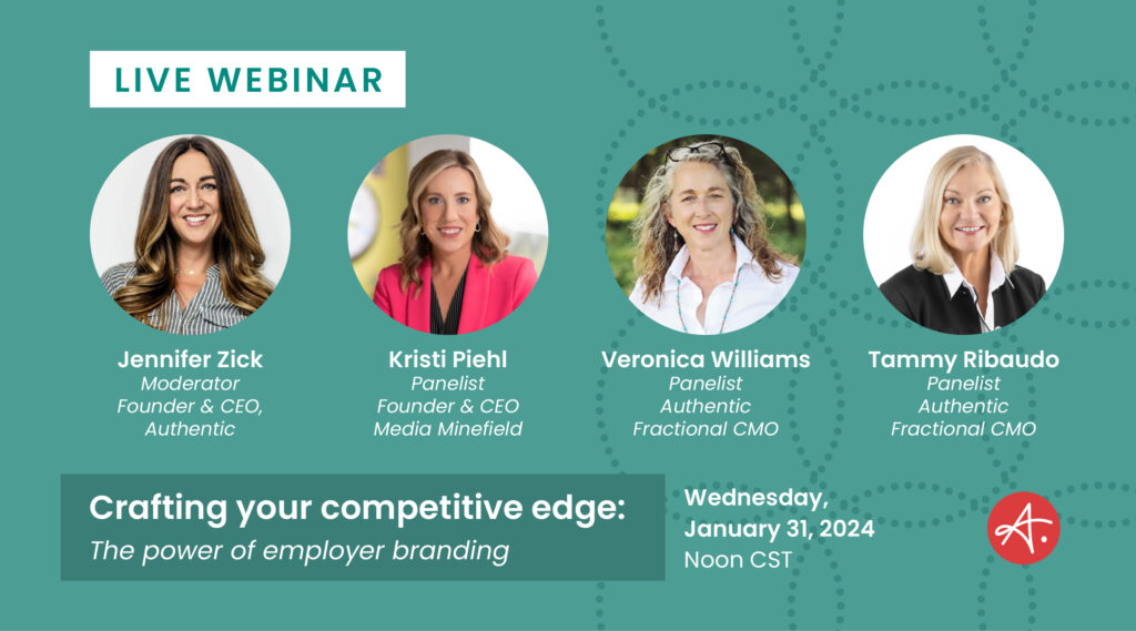 All right, I’ve got just a few introductions and announcements to make, so we don’t want to waste your time. We want to make this hour really count. So let’s get started. Hi, I’m Jennifer Zick. I am founder and CEO of Authentic. We are a community of fractional chief marketing officers that works with growing businesses all across the US, sometimes beyond helping them to Overcome Random Acts of Marketing® and confidently take the next right step toward healthy growth. Absolutely delighted to be with you here today for the next discussion within our Authentic growth webinar series. Today we’re going to talk about a super relevant topic that’s important for any company that employs human beings. So if you’re one of those company representatives, we’re so glad that you’re here with us today as we chat about employment brand.